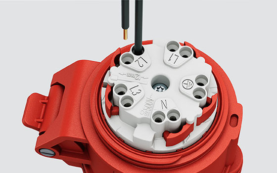 MENNEKES wall mounted and panel mounted receptacles in 16 and 32 A are equipped with out time-saving spring terminal technology TwinCONTACT. You simply remove the insulation from the wire and insert the conductor into the receptacle. Coded twin clamps securely hold the conductor in the right place. If you want to release the conductor again, you can easily disconnect it by pressing the red release button.