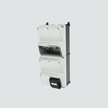 receptacles up to 63 A, Cepex data port sockets, or RCD and MCB breakers. These combinations come wired and ready to connect, with an internal separator between the data and power functions. They can be retrofitted at any time with data sockets. These solutions are available in three different colors: light gray, silver, and signal yellow.